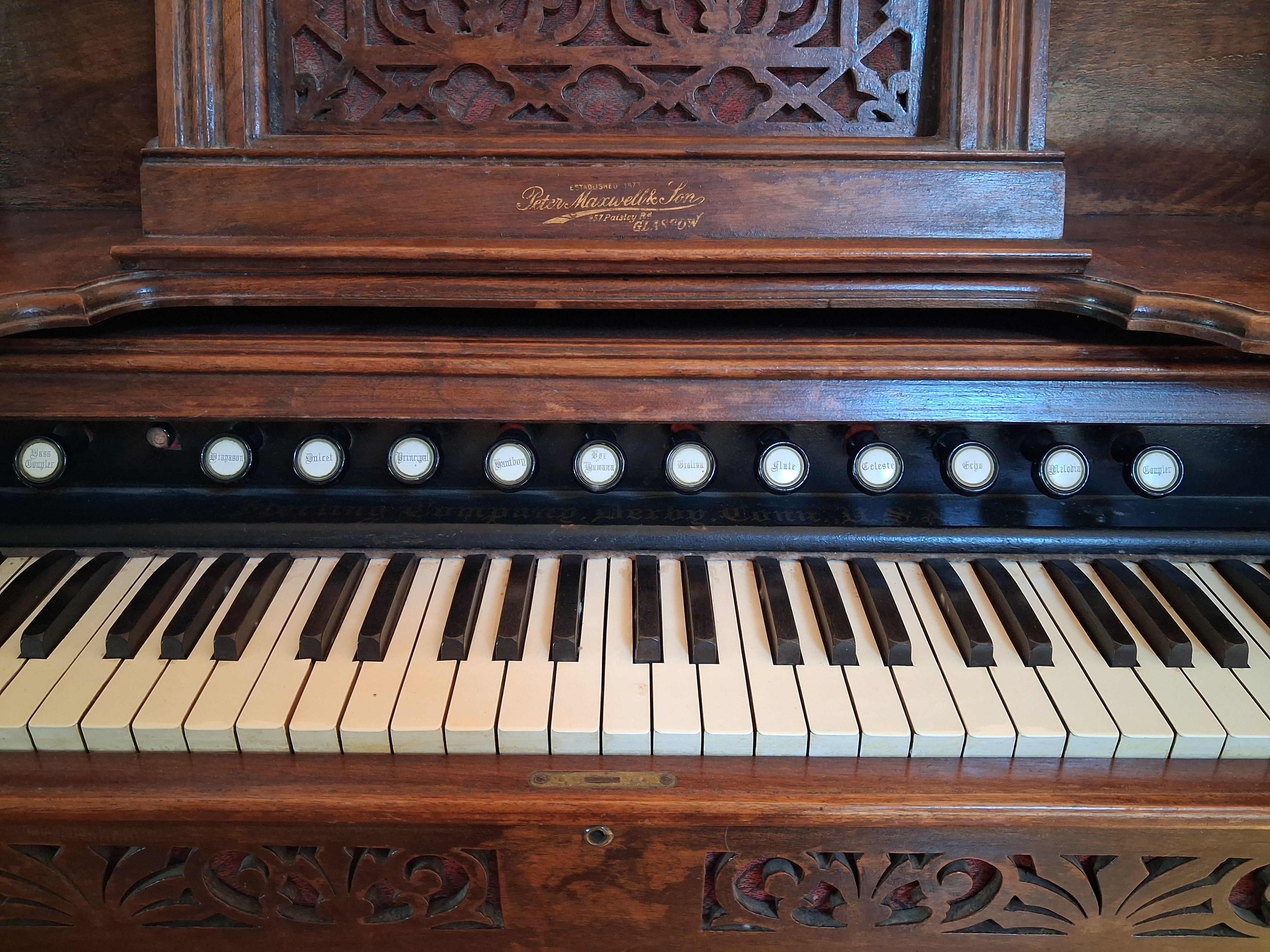 Reed organ marked 'Peter Maxwell & Son, 457 Paisley Rd. Glasgow'. It is located near Kirkby Lonsdale, Cumbria. It is in an upstairs room! Cabinet in good condition, only one pedal working.