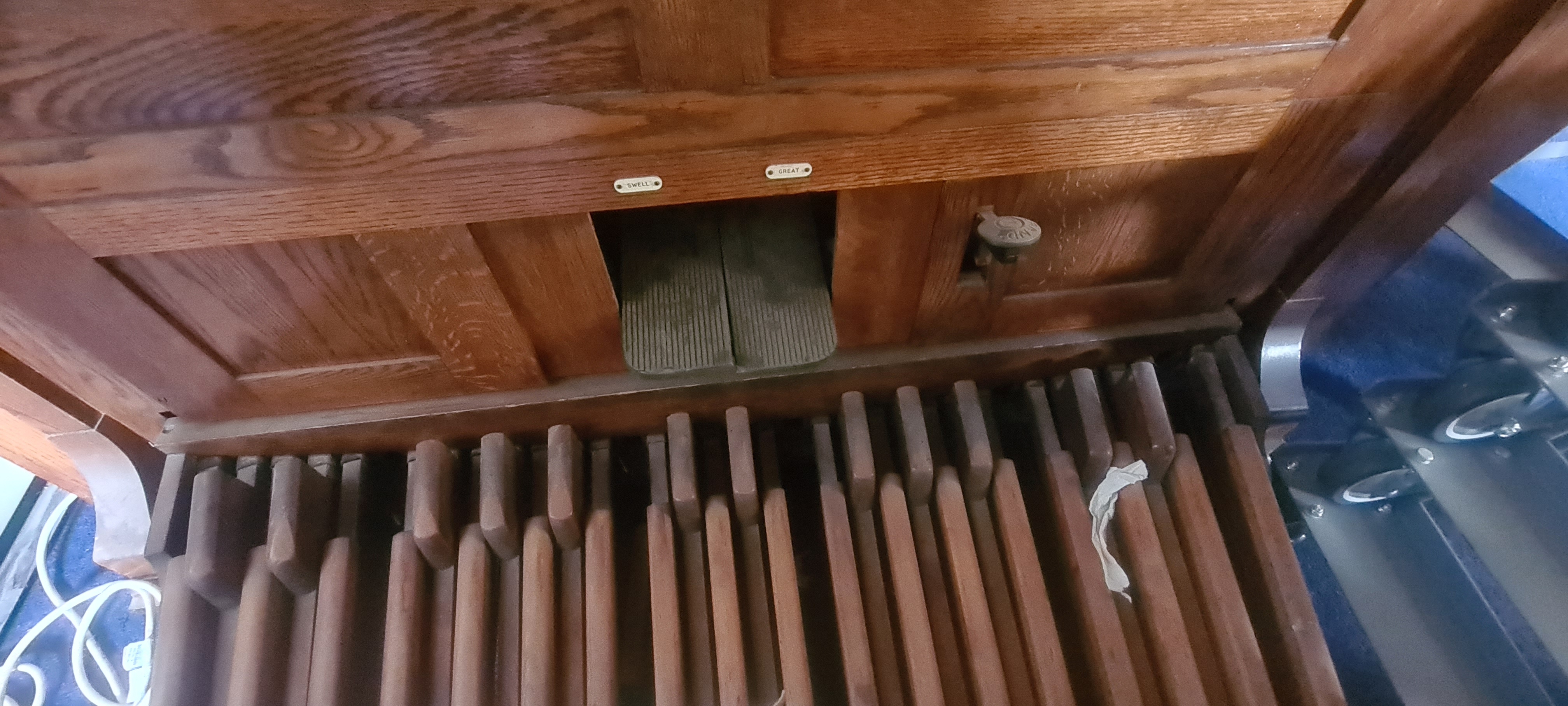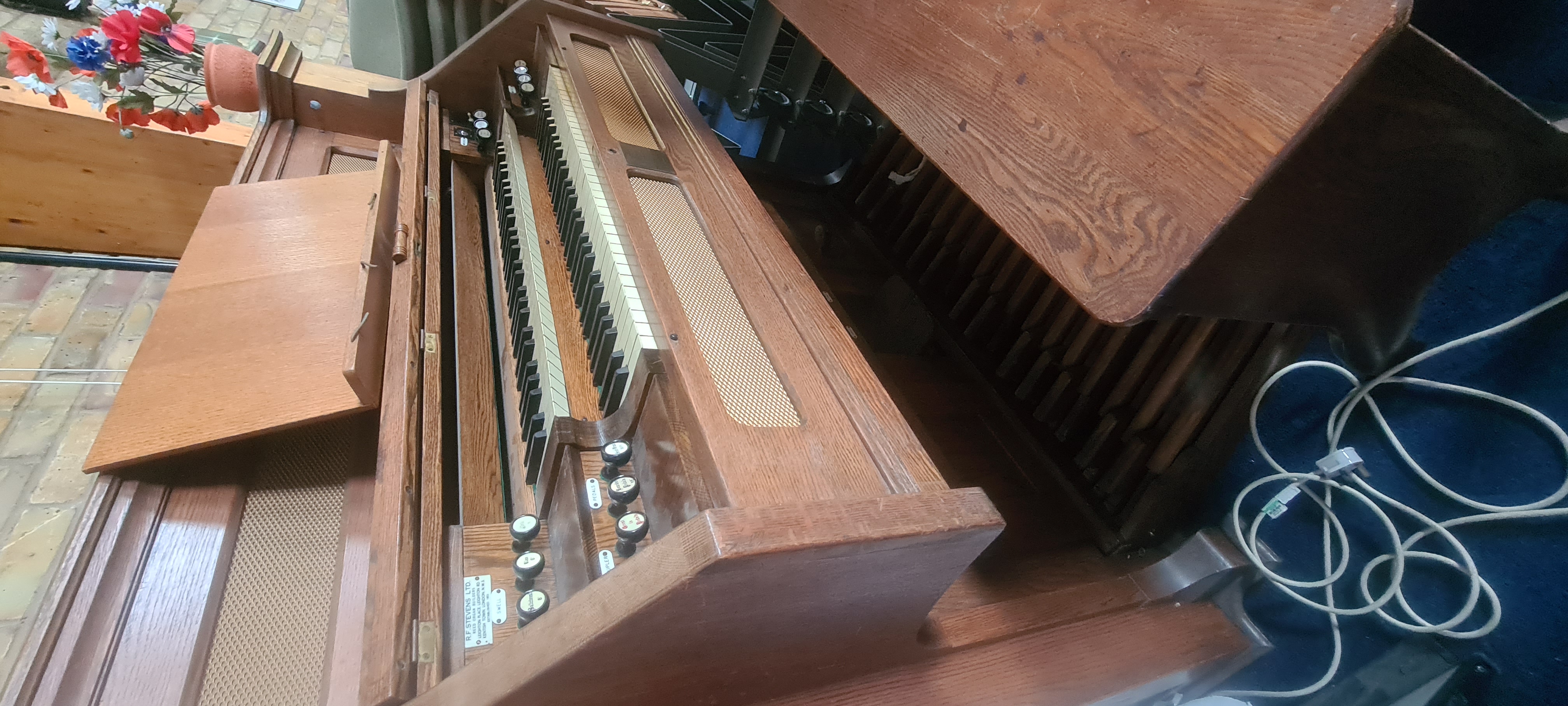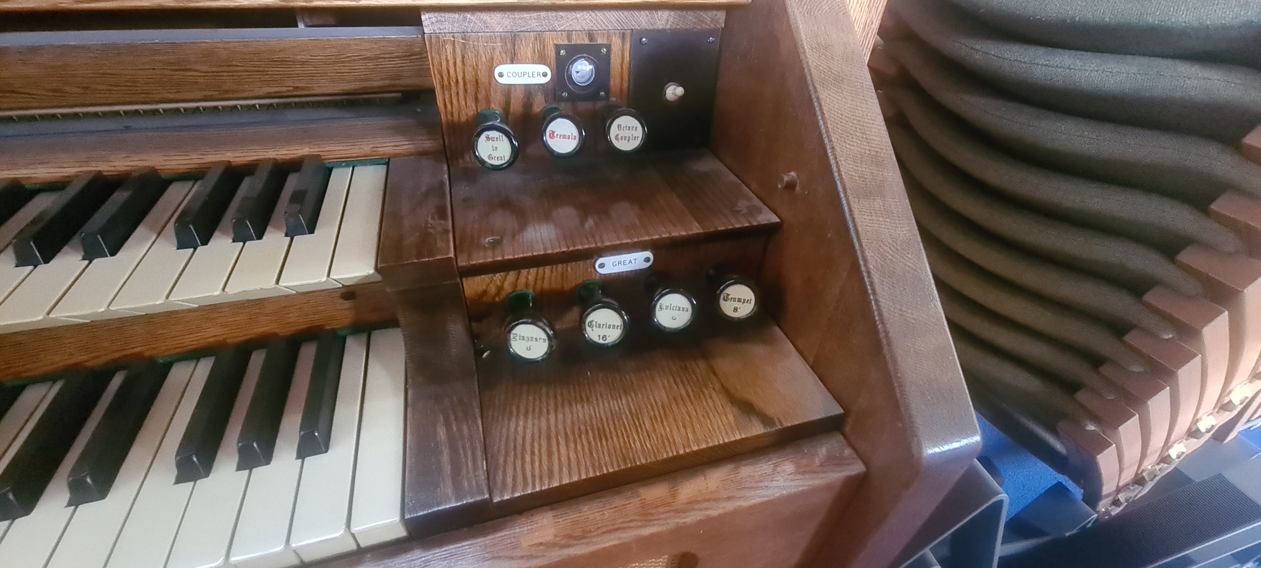 Stops (from left): Bass coupler, Bourdon Bass 16ft, Diapason Bass 8ft, Dolce 8ft, Viola 4ft, Vox Humana, Principal Treble 4ft, Dulcet 8ft, Diapason Treble 8ft, Bourdon Treble 16ft, Treble coupler.