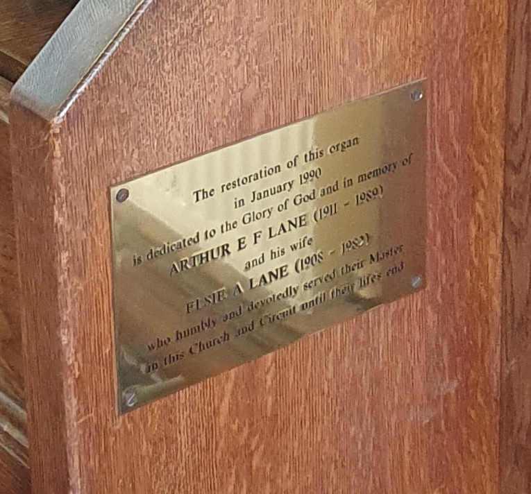 Stop List: Viola 4ft, Diapason 8ft, Dulcet 8ft, Bourdon Bass 16ft, Bass Coupler, Vox Humana Forte, Treble Coupler, Cremona 16ft, Euphone 16ft, Dulciana 8ft, Melodia 8ft, Vox Angelica 4ft, Flute 4 ft Plus the usual two knee levels for Full Organ and Swell (Forte).