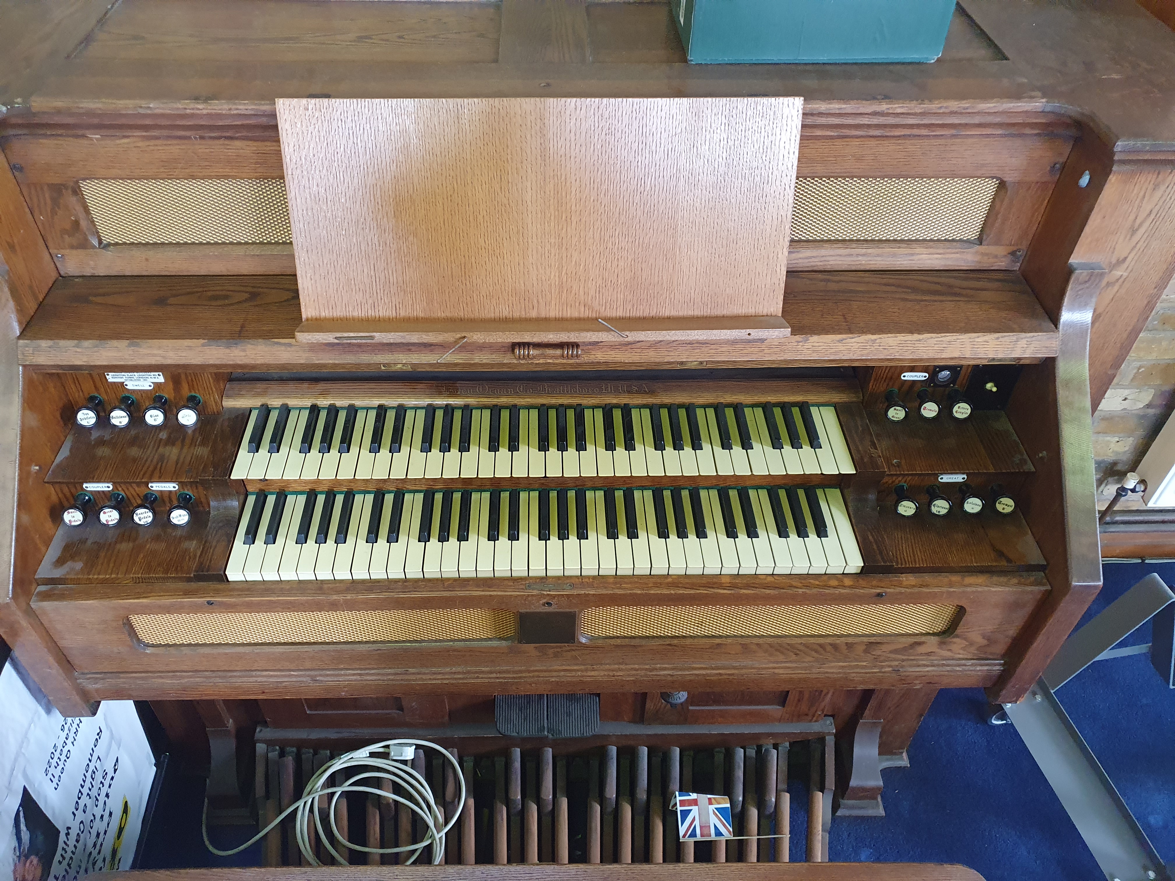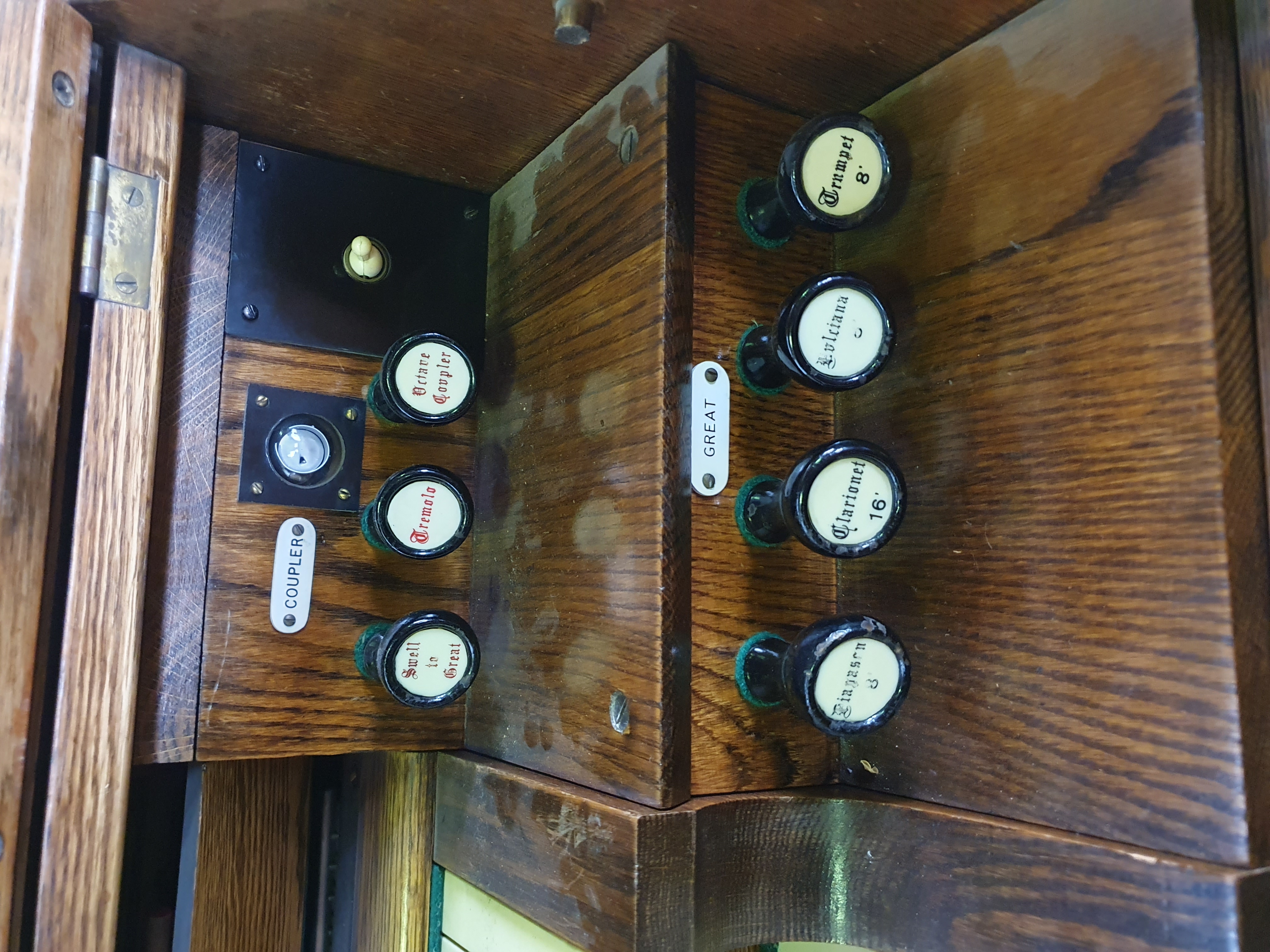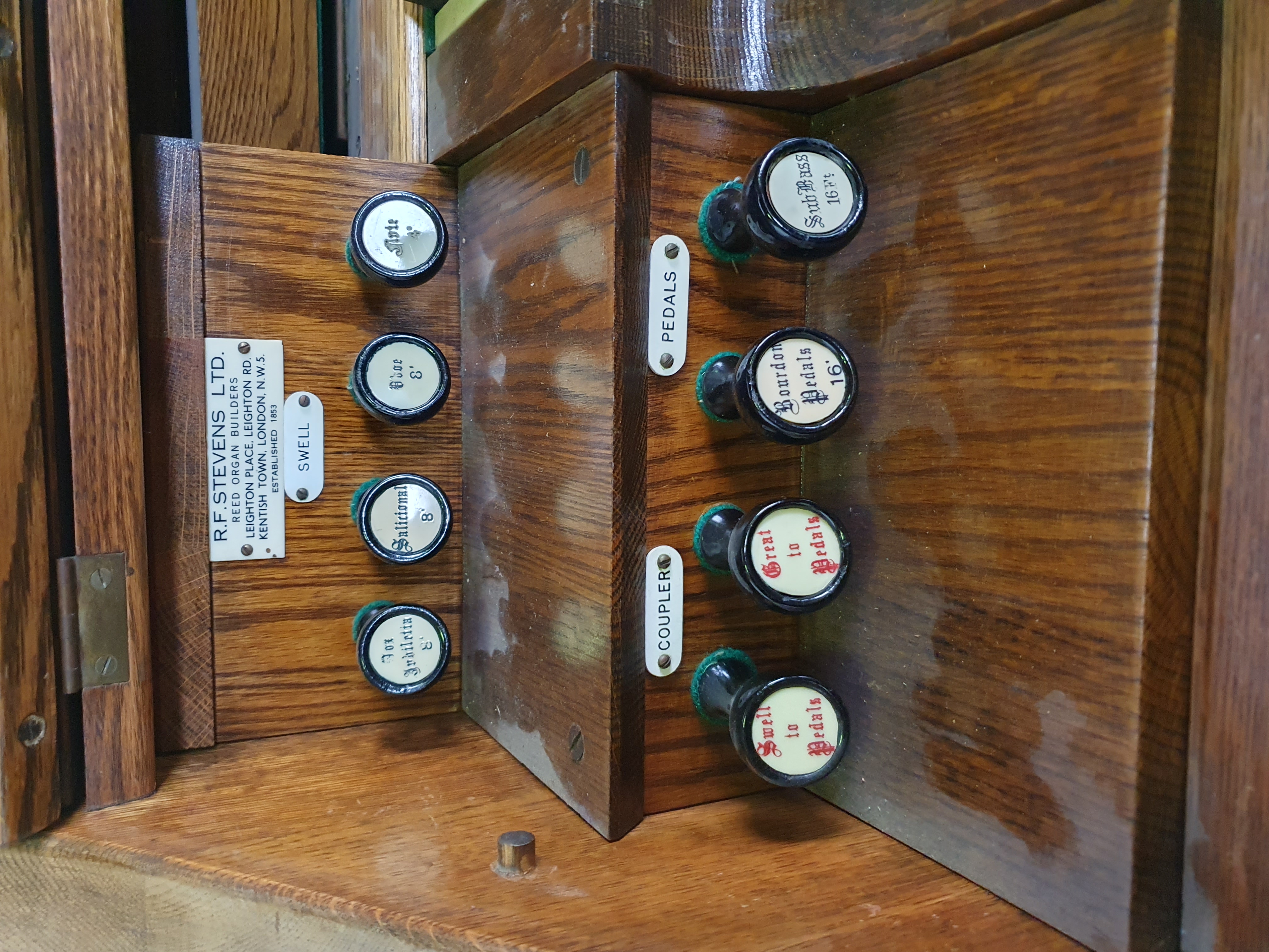 Stops (from left): Bass coupler, Bourdon Bass 16ft, Diapason Bass 8ft, Dolce 8ft, Viola 4ft, Vox Humana, Principal Treble 4ft, Dulcet 8ft, Diapason Treble 8ft, Bourdon Treble 16ft, Treble coupler.