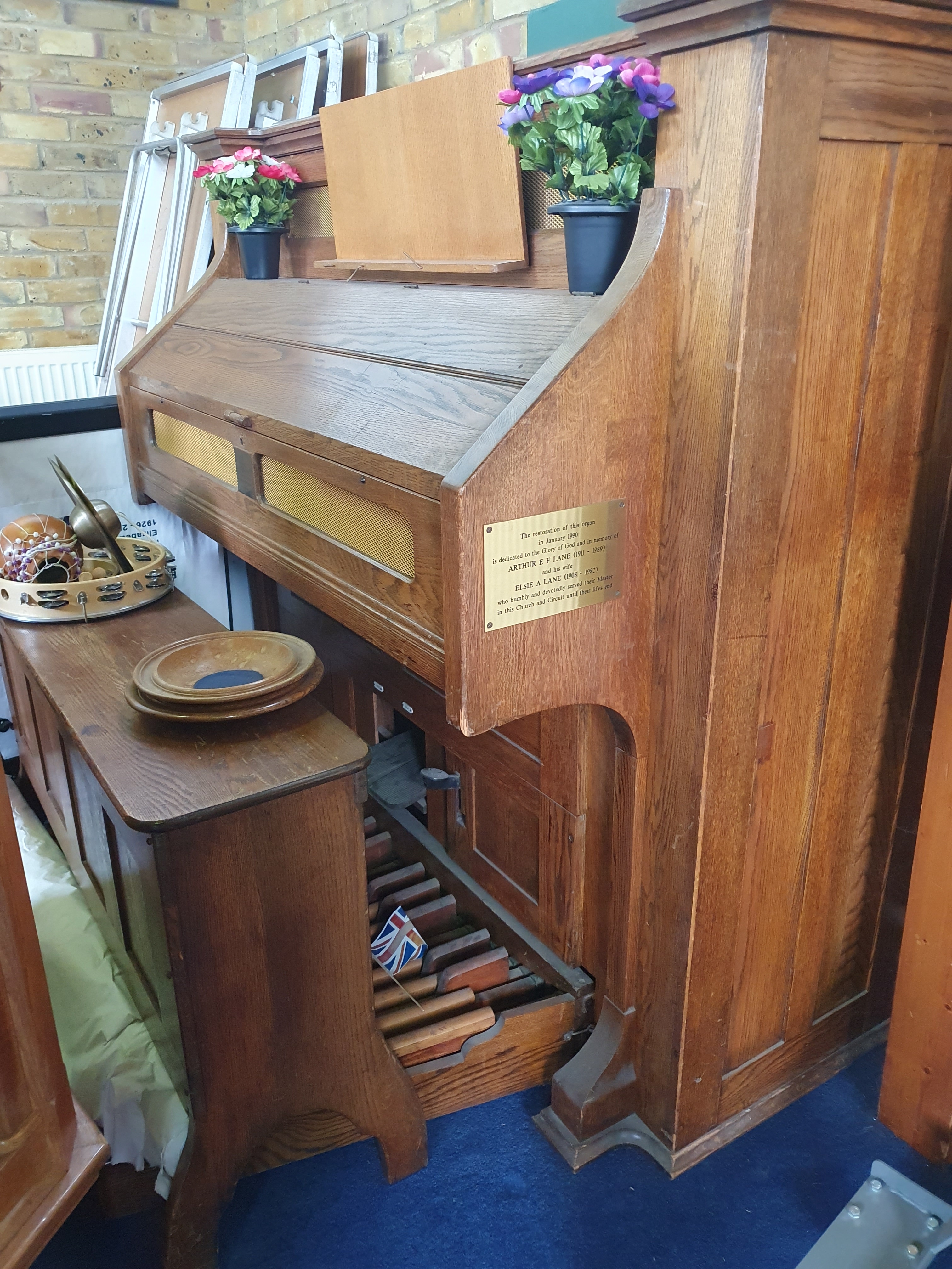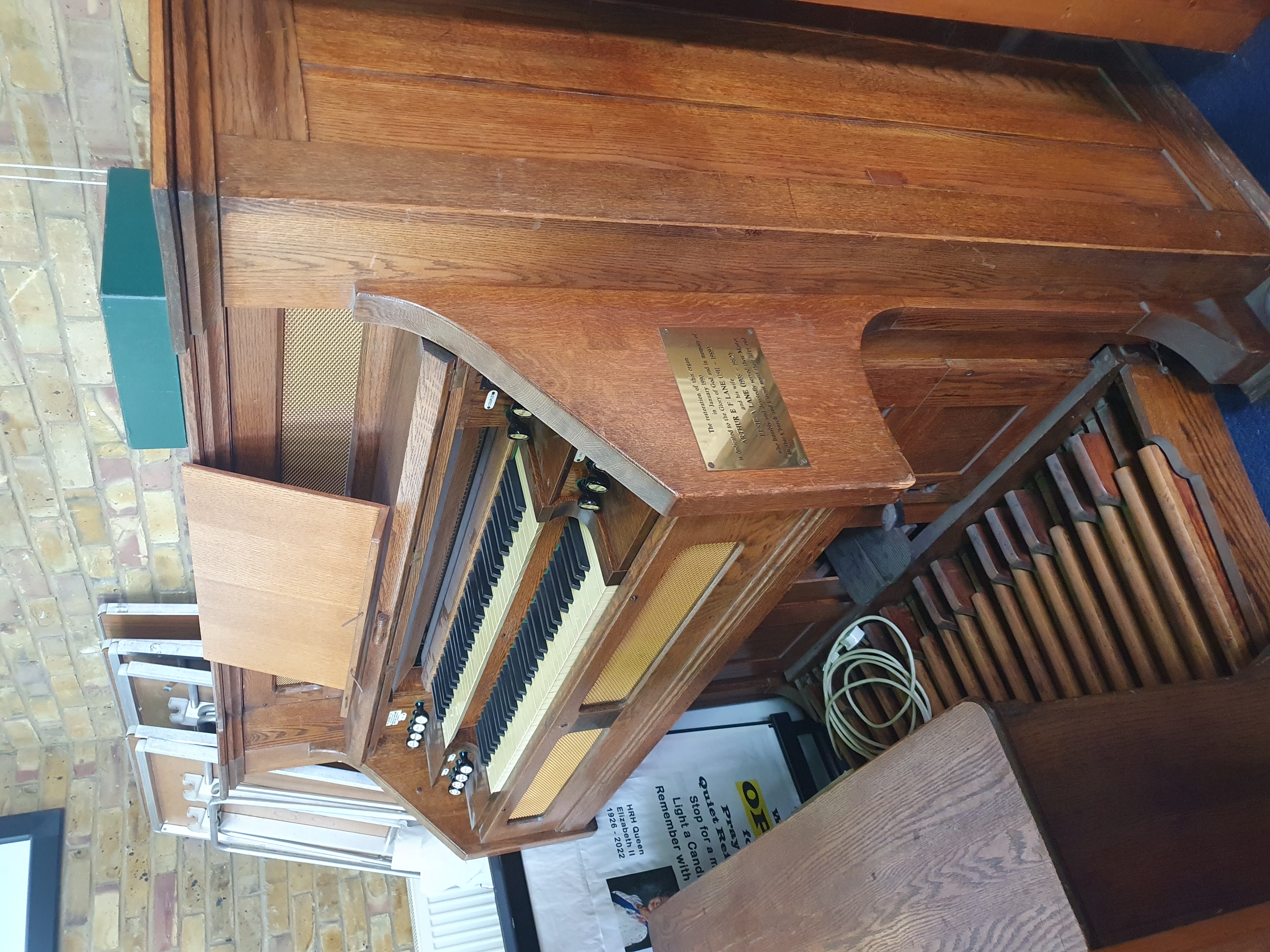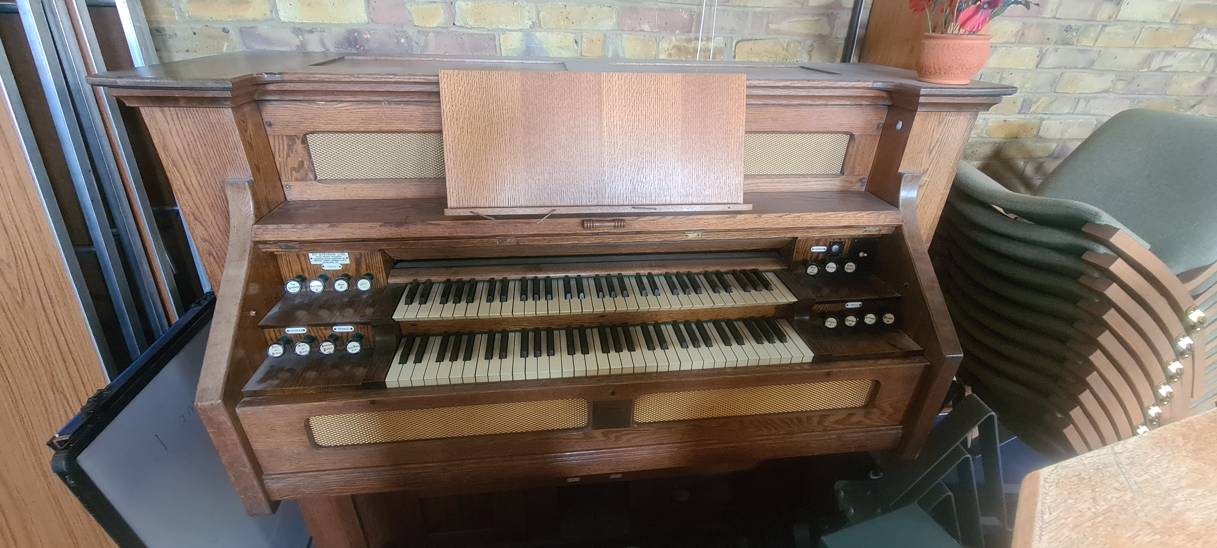 Stops (from left): Bass coupler, Bourdon Bass 16ft, Diapason Bass 8ft, Dolce 8ft, Viola 4ft, Vox Humana, Principal Treble 4ft, Dulcet 8ft, Diapason Treble 8ft, Bourdon Treble 16ft, Treble coupler.
