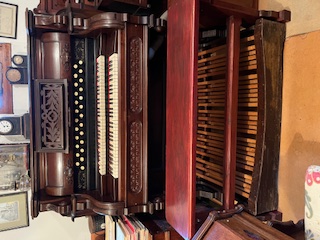 Acquired this single manual Reed organ 25 years ago. In working order. Stops: Diapason 8ft, Dulcet 8ft, Sub bass 16ft, BassCoupler, Vox Humana, Forte, Treble coupler, Echo 8ft, Celeste 8ft, Dulciana 8ft, Melodia 8ft.